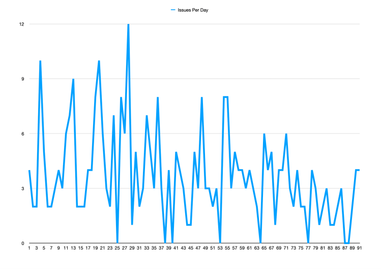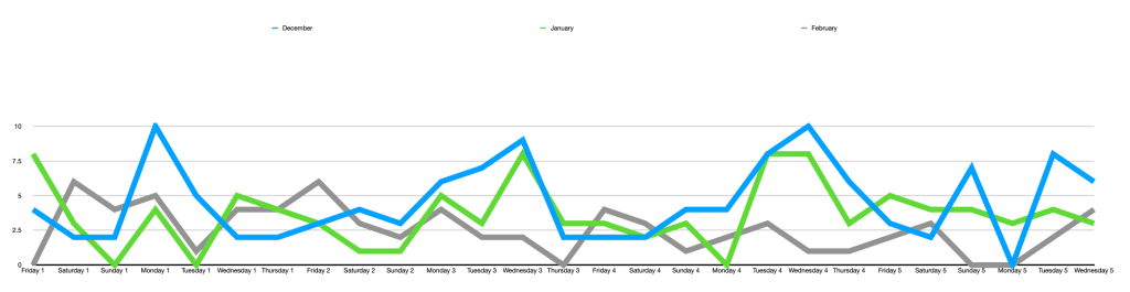 It is possible to take an alternative look at the same dataset by trimming certain aspects and evaluating each month against each other by lining up the week days. Initially, there was a comparison created between the months via their date however there was little to no correlation with this dataset. Below however, displays the issues experiences over in accordance with the day of the week over the course of three months.